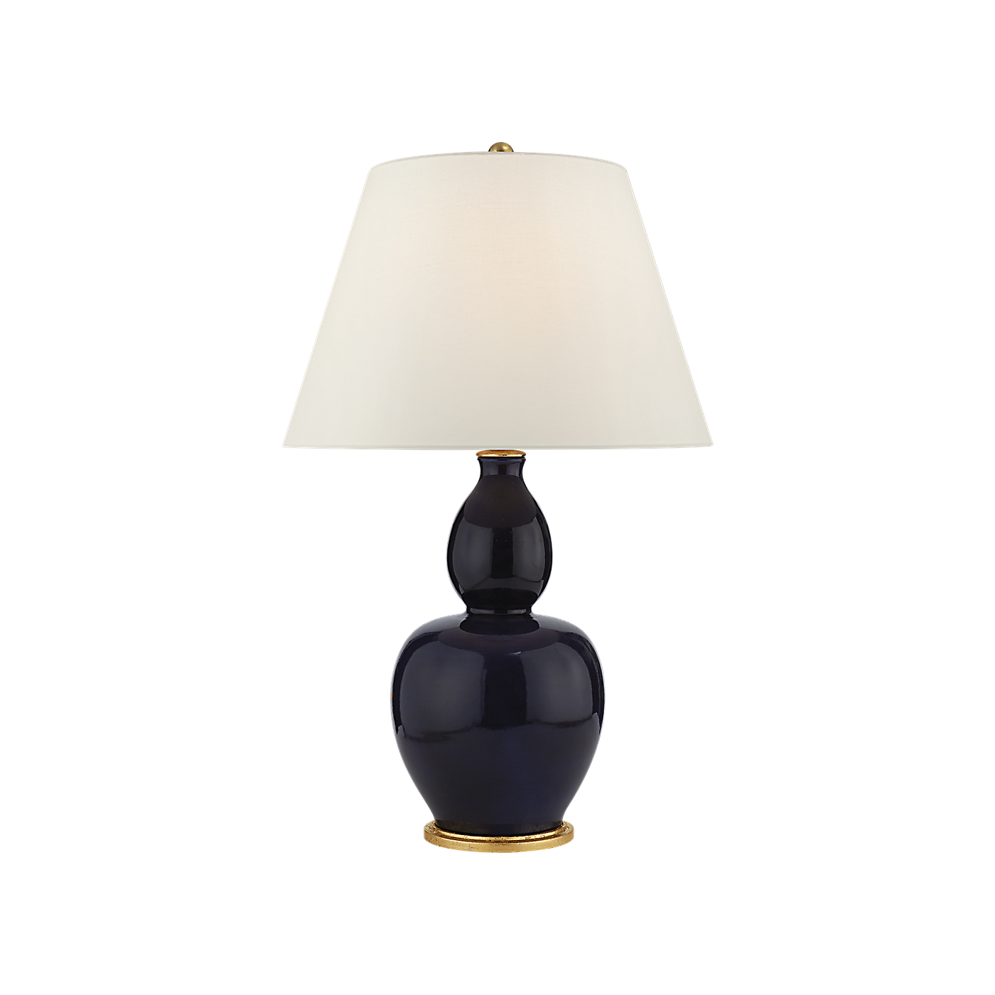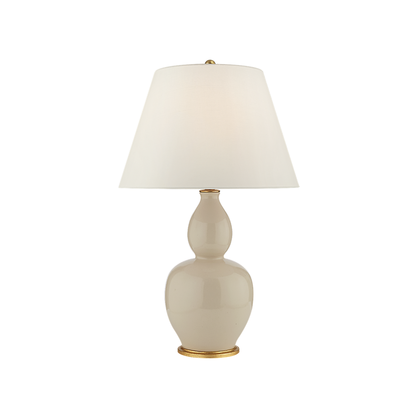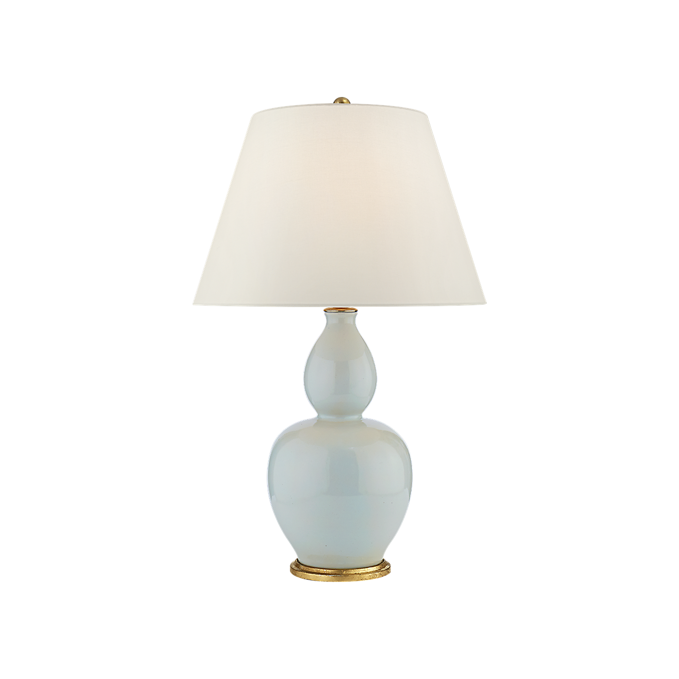 The Yue Double Gourd Table Lamp adds a touch of elegance to any room. Its reactive ceramic glazes create unique color and texture variations. The lamp features a linen shade, providing a soft and diffused light. It requires one incandescent A19 bulb with an E26 dimmer socket.
