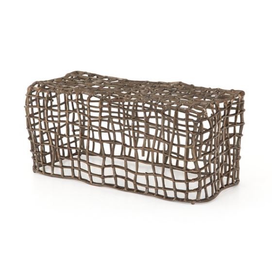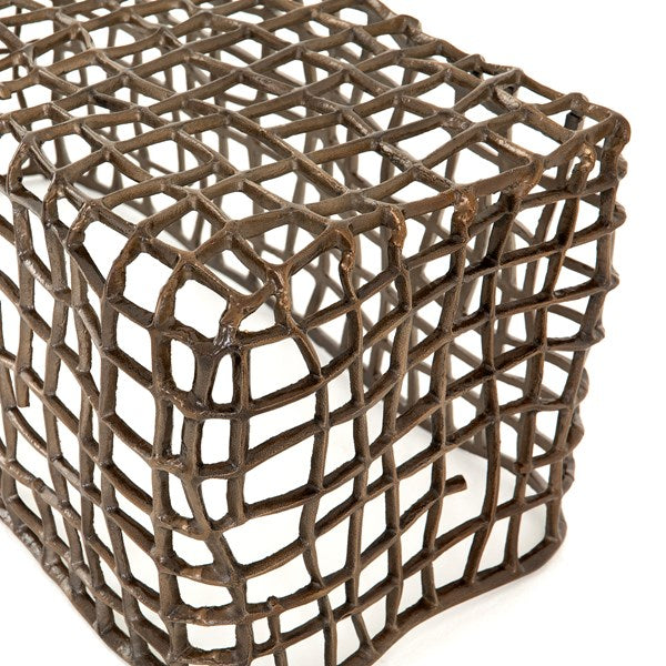 Aged bronze-finished aluminum forms a fluid, cage-like bench, for a forward-thinking look with clever distinction, indoors or out. Cover or store indoors during inclement weather and when not in use.