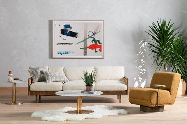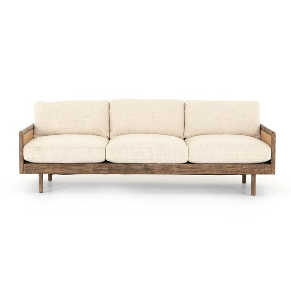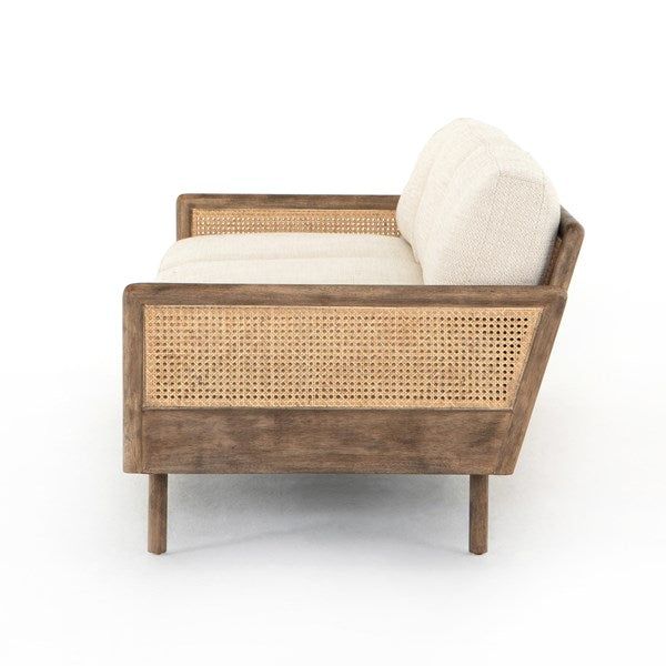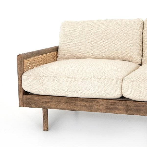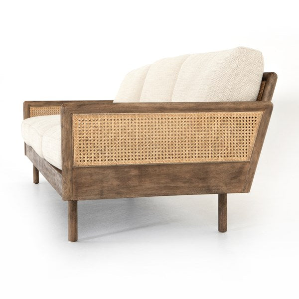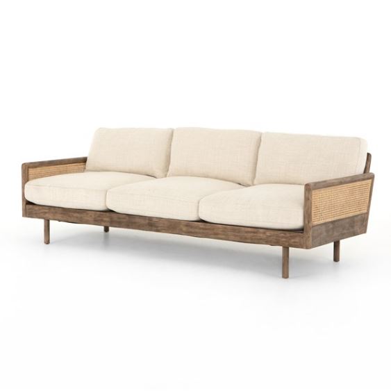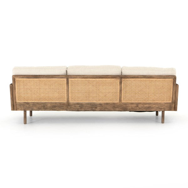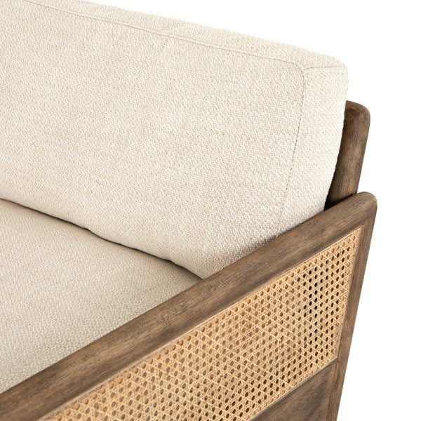 Scandinavian inspiration at its finest. Solid parawood framing features side panels of natural cane, for a textural and trend-forward material mix, with creamy taupe high-performance upholstery and feather-blend cushioning for unmatched comfort.