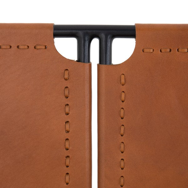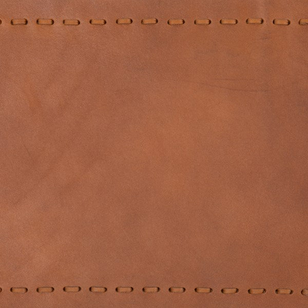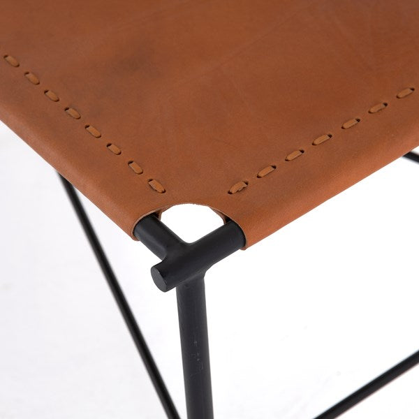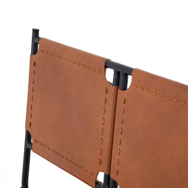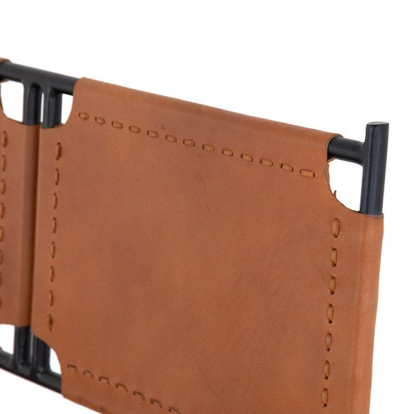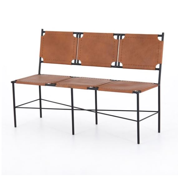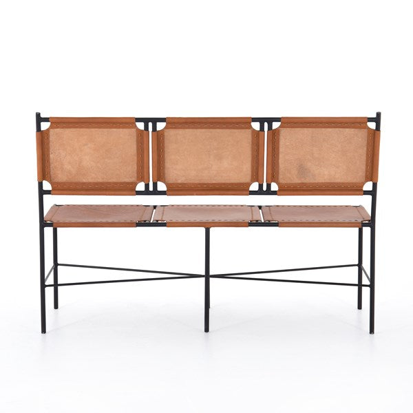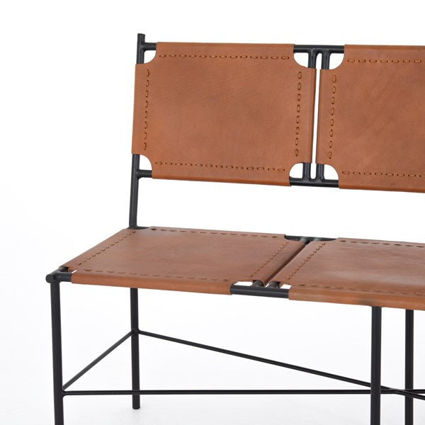 Slim and sophisticated. Bench-style seating of warm, caramel-colored top-grain leather features exposed hand stitching for modernity, with gunmetal-finished iron framing for a balanced, lightweight look.